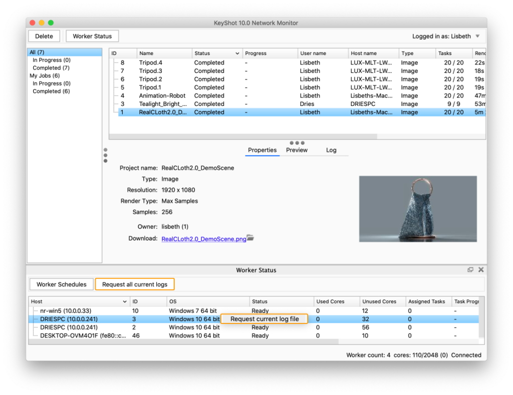 - For logs from specific worker: Right-click the worker, you want logs from, and select Request current log file.