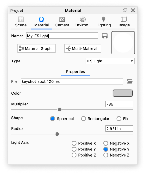 You can use the default shape from the IES file or customize the shape by selecting either Spherical or Rectangular in the shape setting for the IES light material.