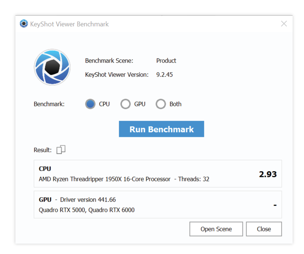 KeyShot Viewer has the ability to run benchmark scenes and report feedback for independent CPU and GPU testing, as well as combined CPU and GPU testing.