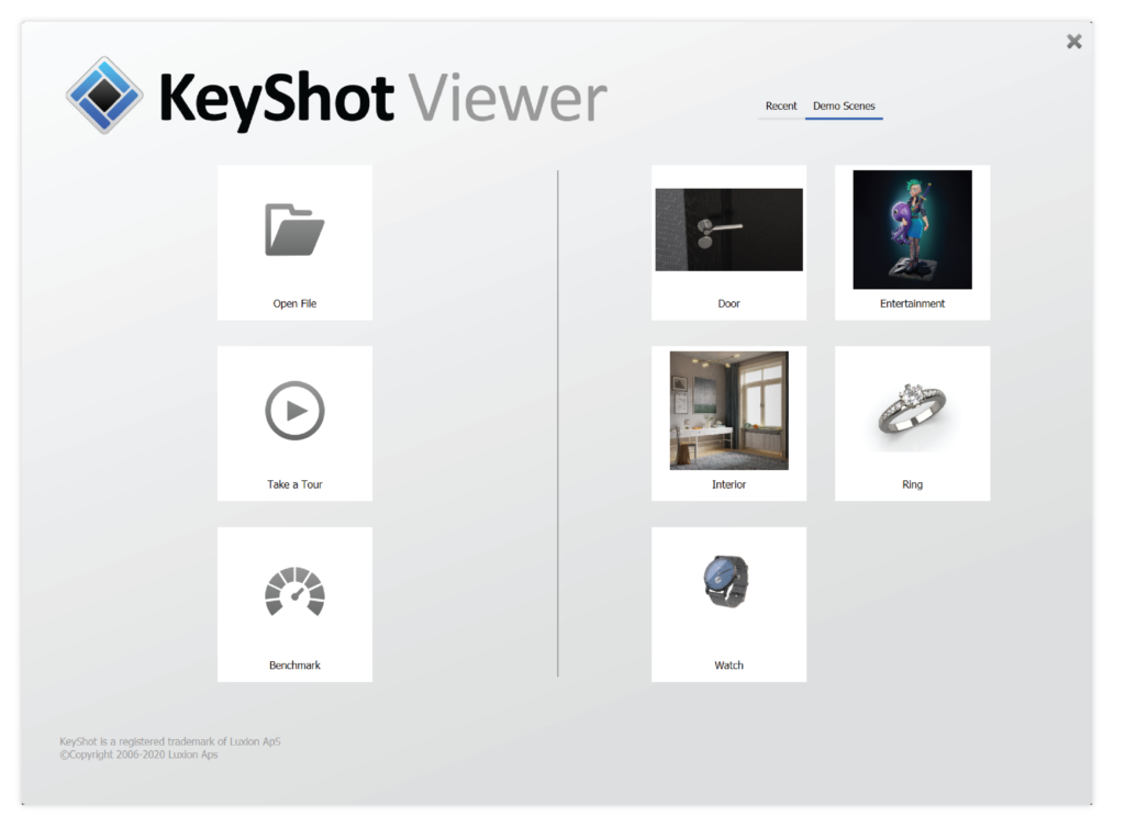 When KeyShot Viewer is launched you will be prompted with a splash screen where you can browse to open a file, take a tour, run benchmark mode, select from those recently opened, or open a demo scene.