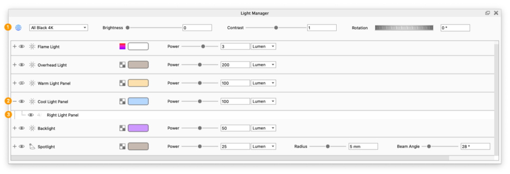 - In the top of the Light Manager you can set the current environment and adjust the brightness, contrast and rotation. Learn more about the environment settings here