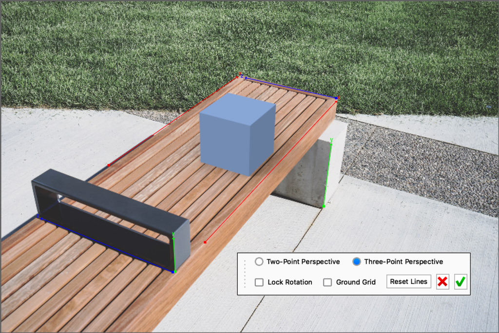 A widget appears in the Real-Time View and you will also notice 2 or 3 sets of vanishing lines in different colors – The lines and colors correspond to the scene’s coordinate system. X is blue, Z is red, and Y is green. - Select the two-point or three-point perspective depending on what matches your backplate.