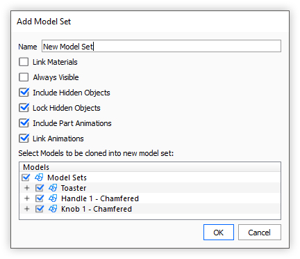 You can also access this dialog by selecting the models/parts in the Scene Tree you wish to include in the new Model Set > right-click and select Create Model Set from Selection.