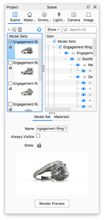 Model Sets (Pro feature) allow you to save independent Scene Tree variations in a single .bip file. The Model Sets interface is located in the Project > Scene tab as a sidebar on the left side of the panel.