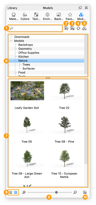 The Models tab located in the Library window contains a selection of models you can use to add context to your scene, as well as whole scenes in which you can display your products.