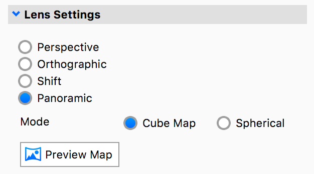 In the Camera tab, under Lens Settings, select Panoramic. Select your desired format of Spherical or Cube Map from the Mode radio buttons. The Real-time View will display a Panoramic Preview message at the top to indicate you are Panoramic mode. This means the camera can be rotated spherically and the real-time rendering in the Real-time View will not occur.