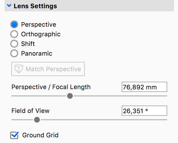 The Perspective / Focal Length controls the amount of distortion (convergence) seen in the Real-time View. Real world values can be used here to replicate camera lens focal lengths.