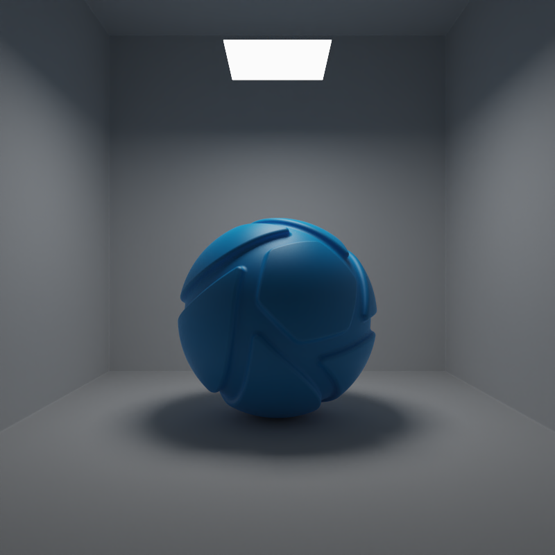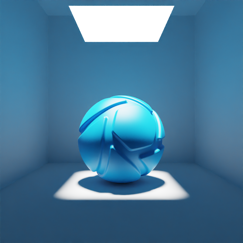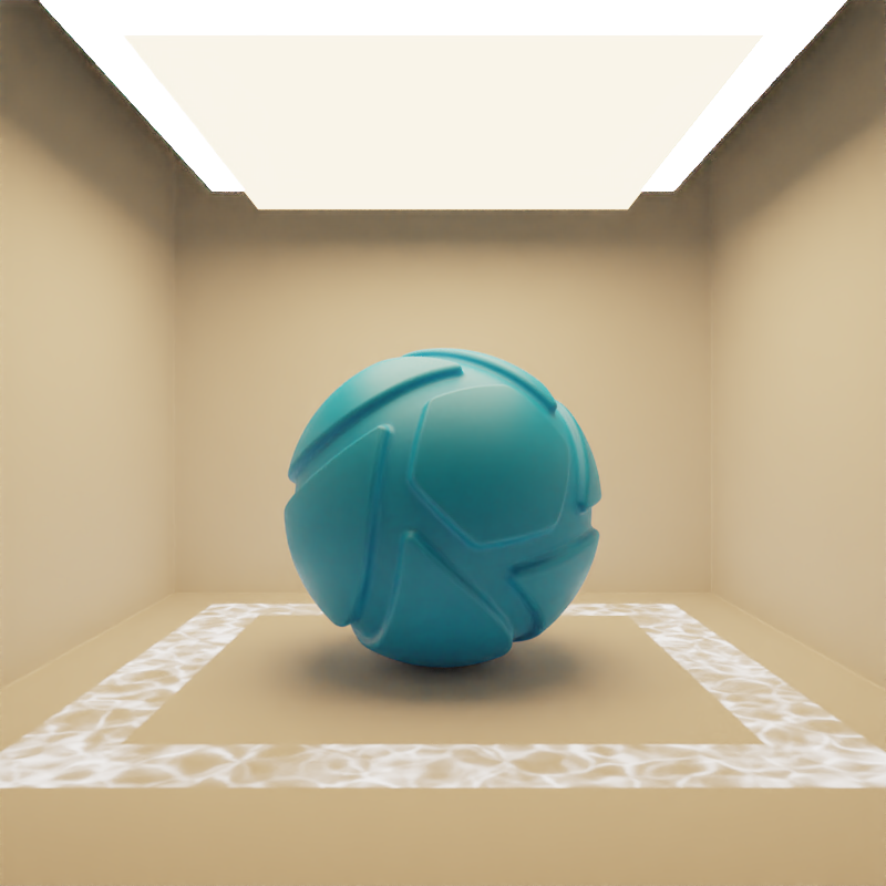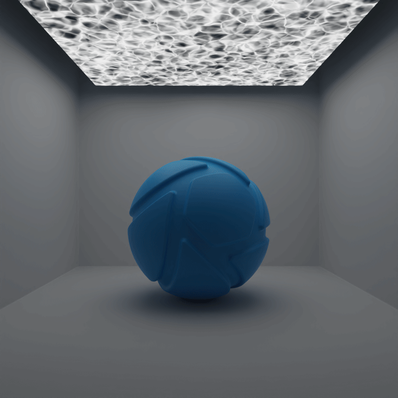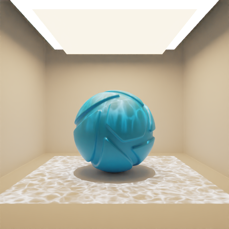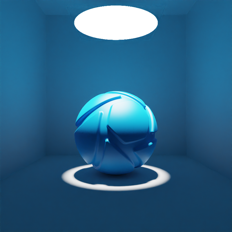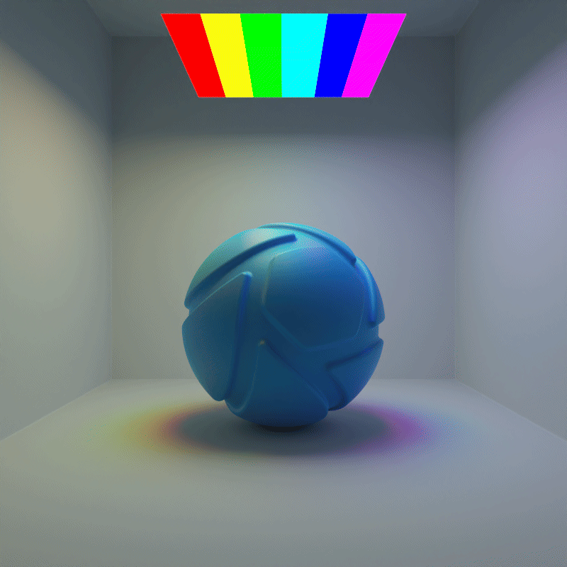The example below shows the effect of toggling visibility in shadows. The scene is lit by a large planar light with a cold color, a Gobo Texture and spread angles at 0,2°. Directly below it, there is a slightly smaller planar light with a warm color and 90° spread angles. Visible in Shadows is toggled for the smaller, warm planar light.
