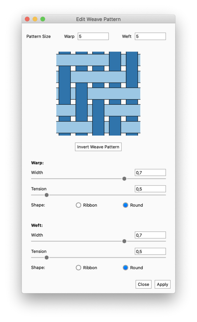 Close/Apply: The changes to the weave pattern won’t be applied instantly. Because calculating the weave pattern may take a some time you have to press apply Apply to see the effect on the cloth in the Real-time View. When you are happy with what you see in the Real-time View you hit Close to hide the dialog.