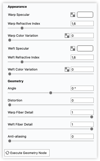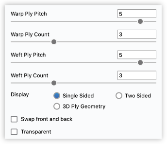 GeometryPly Pitch: Pitch is the metric approach to measuring “thread count”. The value determines the distance along the yarn for a single revolution of a ply (measured along the length of the thread, not the length of the twisted strand) Ply Count: Ply is the number of strands that are twisted around one another to create a single thread Display: There are three settings here, to control how accurate the cloth representation should be.