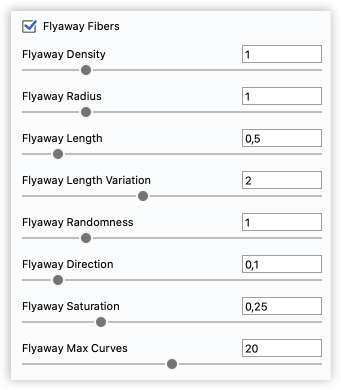 Flyaway Max Curves: Adding large amounts of curves can make the scene very heavy. The amount of curves is impacted by both the density and length variation values. Flyaway Max Curves enable you to limit the overall amount of flyaway curves added pr. part. When the limit is reached, the density of flyaway fibers will be impacted. The limit value is measured in millions and is only approximate. If you don’t want to set a limit just leave the value at 0.