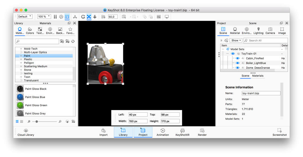When working on scenes in KeyShot Studio with complex lighting or materials and you want to render specific areas faster, region rendering can help maintain an efficient workflow. There are two types of region rendering in KeyShot Studio: