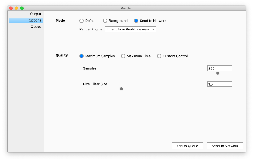 4. Select Render Engine – You can submit jobs to Network Rendering in either CPU or GPU mode. If your computer is capable of rendering both the default choice will be Inherit from Real-time View. Note that some materials/textures are not supported in GPU mode – learn more.