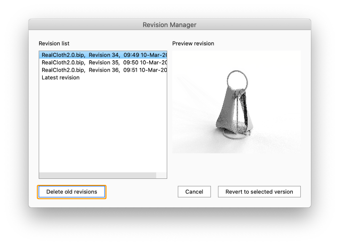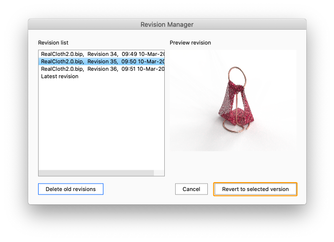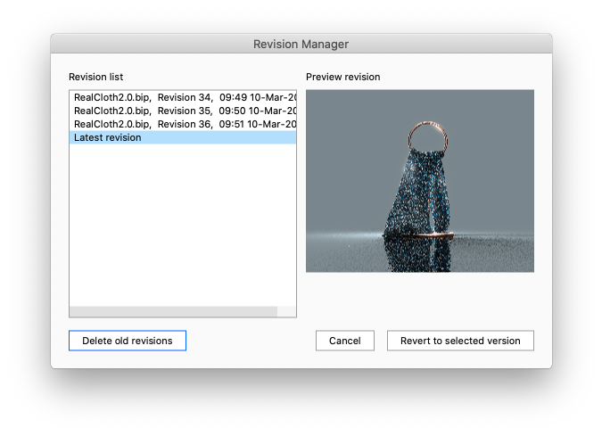 2. From the Revisions list, select the version (revision) of your scene to which you wish to revert. Then, click Revert to selected version.