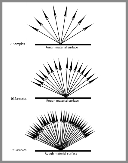 Since glossy materials with some roughness are more complex to render, KeyShot Studio has a setting built in that can improve the accuracy of these rough materials. This setting is called Samples. This allows you to set how many rays are emitted from a pixel in a rendered image. Each ray collects information from its surrounding environment and returns this information back to the pixel to determine the final appearance. You will see the Samples slider when you click the expand arrow next to the Roughness slider.
