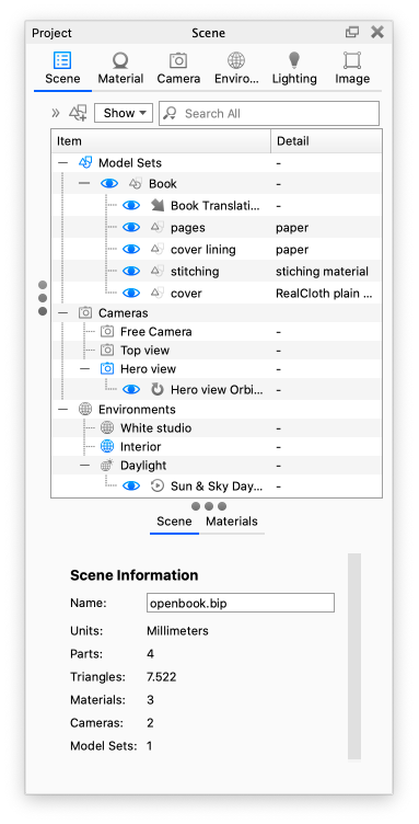 The Scene Tree displays Model Sets/models and their hierarchies along with any cameras and environments that exist in a scene.