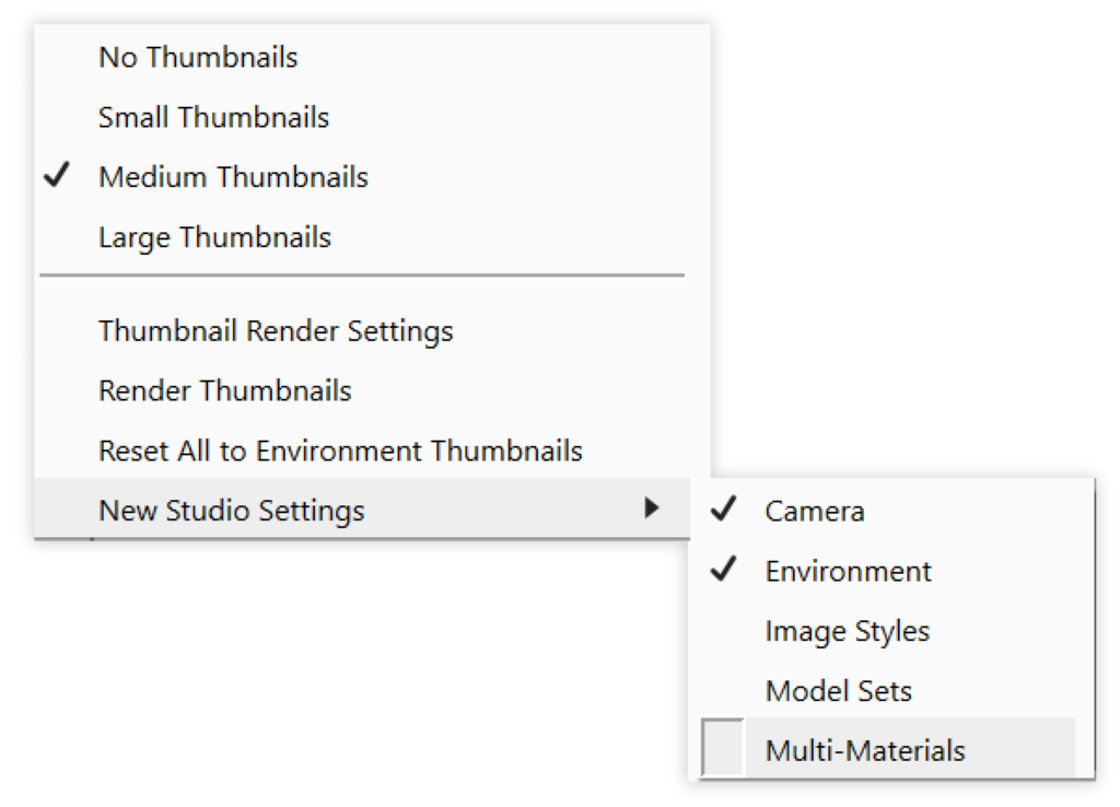When adding a new Studio, the default is set to only include the Camera and Environment each time. However, under the New Studio Settings flyout, you can define which components (Camera, Environment, Image Style, Model Sets, Multi-Materials) are used each time you create a new Studio.