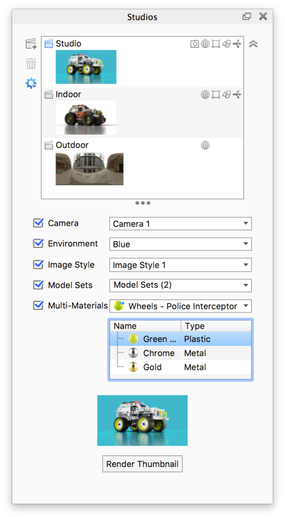 Studios (Pro feature) allow you to combine and save scene/model/material variations in one file for quick creation and presentation. Studios may contain any combination of Camera > Environment > Image Styles > Models Sets or Multi-Materials.